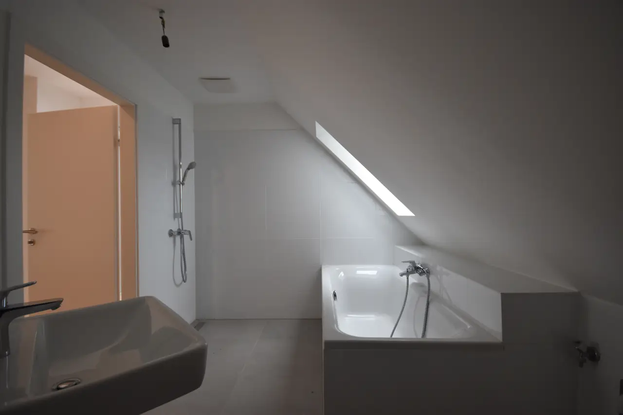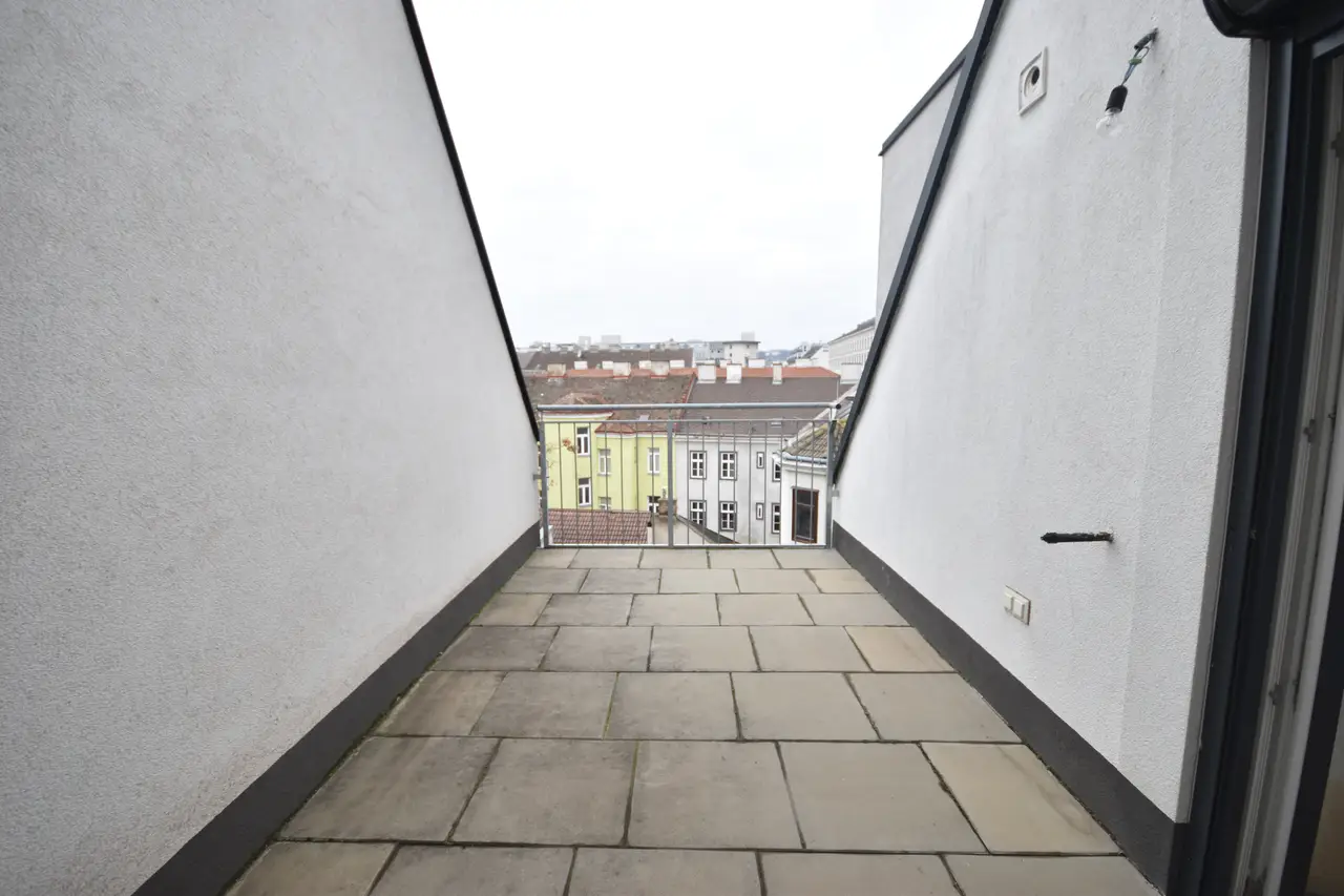 Vom Eingang aus betritt man ein kompaktes Vorzimmer, das ausreichend Platz für eine Garderobe bietet. Rechts davon befindet sich das Badezimmer, ausgestattet mit Dusche, Badewanne sowie einem Anschluss für die Waschmaschine.Links vom Vorzimmer aus gesehen gelangt man in den offenen Wohn- und Essbereich, der direkten Zugang zu einem geräumigen Balkon bietet. Hinter dem Wohn- und Essbereich, auf der rechten Seite gelegen, befindet sich das Schlafzimmer, das ebenfalls einen Zugang zu dem selben Balkon hat.im Wohn- und Essbereich führen Treppen in das obere Stockwerk. Von dort gelangt man direkt zu einem kleinen Abstellraum. Auf der linken Seite befindet sich ein mittelgroßer Raum, der sich ideal als weiteres Schlafzimmer oder als Büro mit gemütlicher Leseecke eignet. Von diesem Raum aus hat man außerdem Zugang zu einer charmanten Dachterrasse.