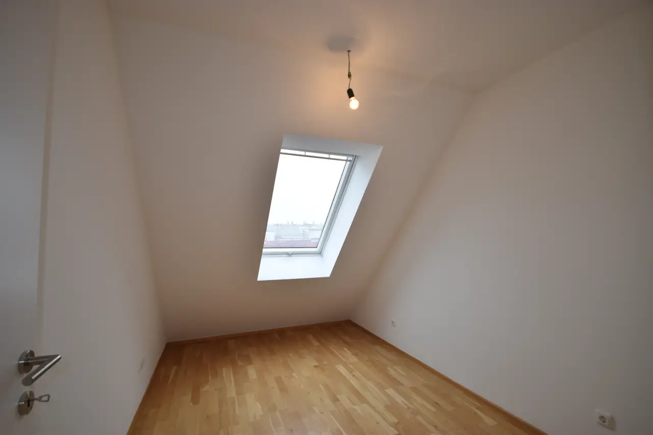Ebenfalls vom Vorraum aus führen die Treppen in das obere Stockwerk. Oben angekommen, befindet sich auf der rechten Seite der Zugang zu einer charmanten Dachterrasse mit einem weitläufigen Blick über die Silhouette von Wien. Nur wenige Schritte entfernt liegt ein etwas kleinerer Raum, der ideal als Kinderzimmer oder Büro genutzt werden kann.Zusätzlich gibt es einen kleinen Abstellraum, der von beiden Seiten begehbar ist.